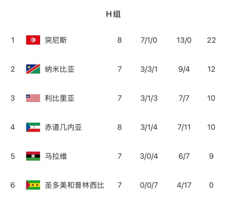 突尼斯8戰(zhàn)7勝1平積22分排名H組第一,提前鎖定小組第一并順利晉級世界杯。