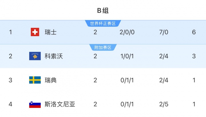 世歐預(yù)B組積分榜,瑞士2連勝領(lǐng)跑,科索沃3分第2,瑞典和斯洛文尼亞均2輪不勝積1分。