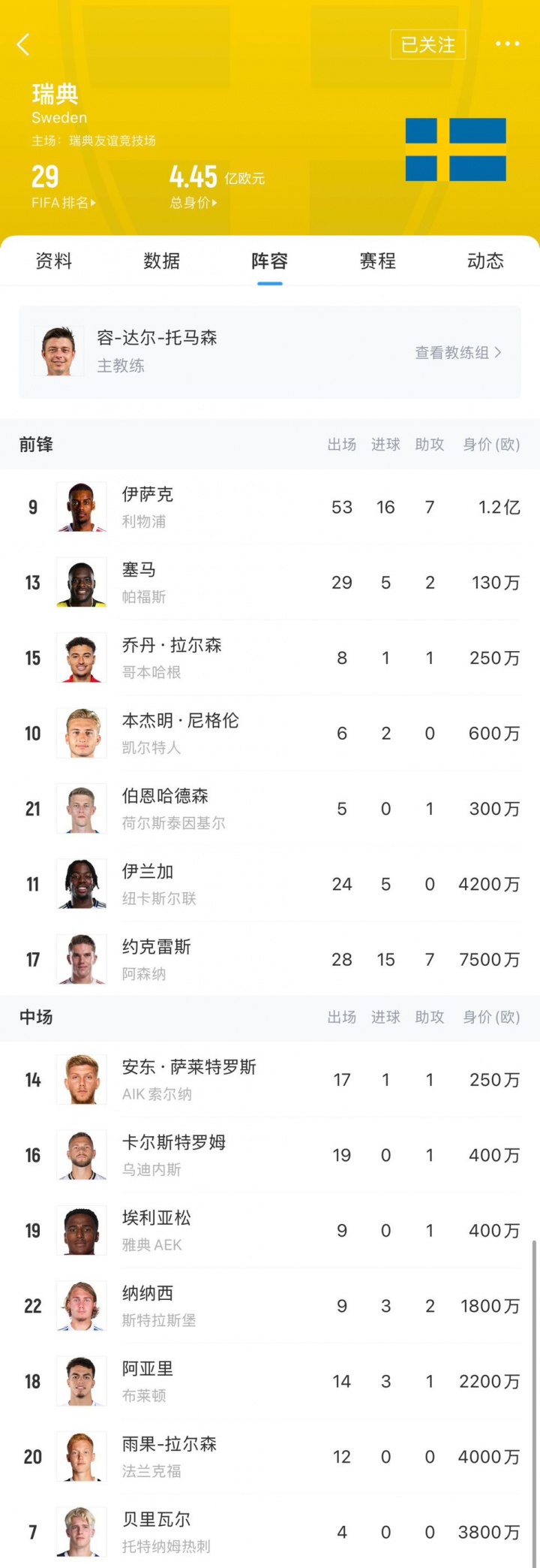 瑞典全隊(duì)身價高達(dá)4.45億歐,位列世界第10,陣中有身價1.2億歐的伊薩克(利物浦)、7500萬歐的約克雷斯(阿森納)、4200萬歐的伊蘭加(紐卡)、4000萬歐的雨果-拉爾森(法蘭克福)、3800萬歐的貝里瓦爾(熱刺)和3000萬歐的希恩(亞特蘭大)。