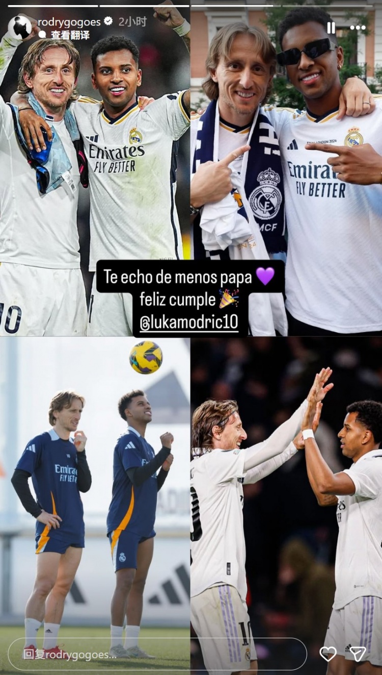 9月9日訊 莫德里奇迎來40歲生日,前皇馬隊友羅德里戈在個人社媒曬出多張兩人昔日合影為其慶生。