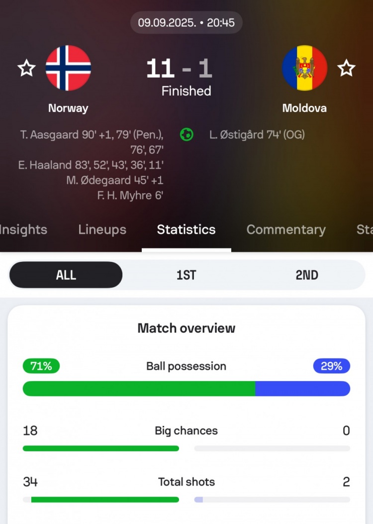 9月10日訊 挪威在本輪世預(yù)賽11-1血洗摩爾多瓦,sofascore數(shù)據(jù)統(tǒng)計(jì)顯示挪威本場(chǎng)共計(jì)射門34次、創(chuàng)造重大進(jìn)球機(jī)會(huì)18次。