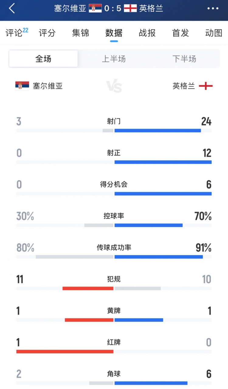 兩隊(duì)全場數(shù)據(jù)對比如下(主隊(duì)塞爾維亞在前,客隊(duì)英格蘭在后):