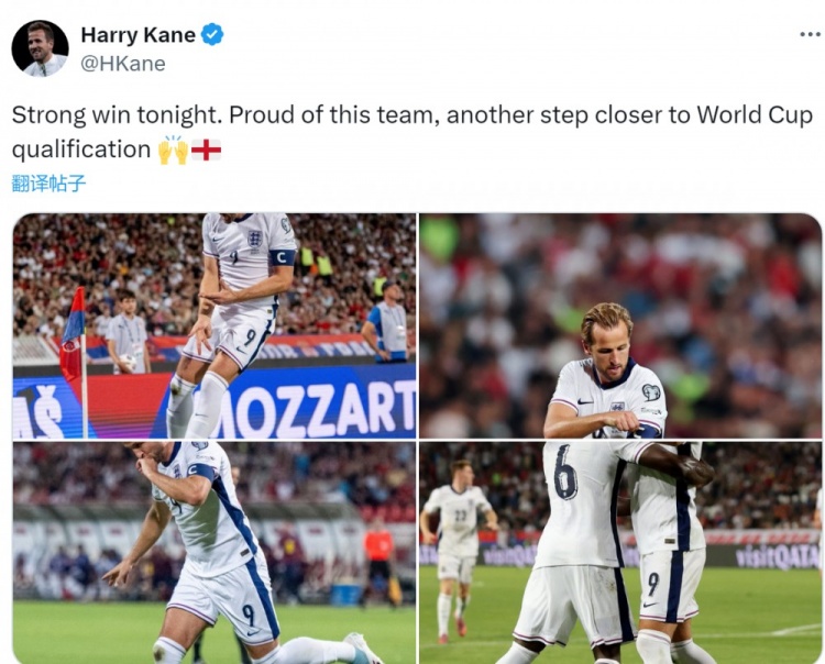 凱恩社媒曬出比賽照片,配文:“今晚大獲全勝,為球隊感到驕傲,距離晉級世界杯又近了一步。”