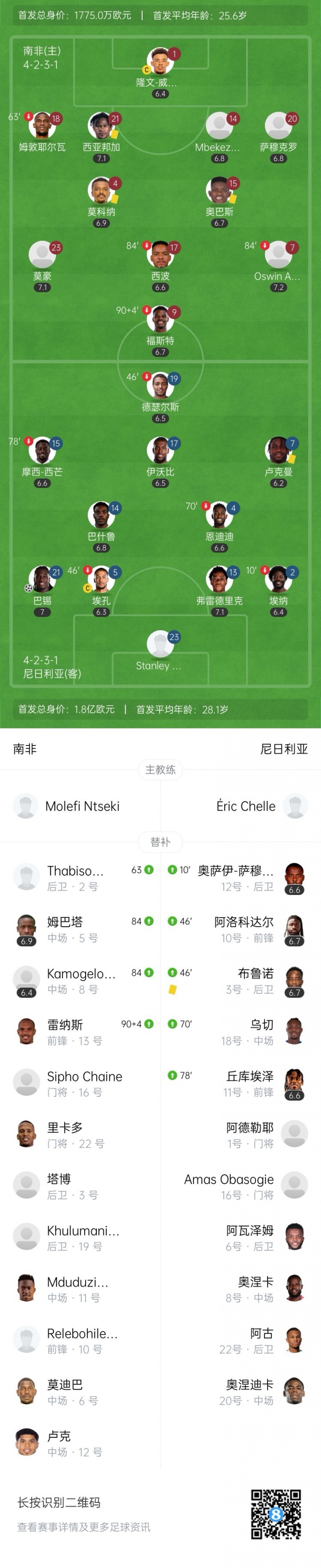 本場比賽,雖然身價(jià)7000萬歐的奧斯梅恩傷缺,但尼日利亞全隊(duì)身價(jià)仍有1.8億歐,首發(fā)有伊沃比、盧克曼。比賽第25分鐘尼日利亞后衛(wèi)??诪觚?,第44分鐘貝西破門,之后雙方再無建樹,最終戰(zhàn)成1-1平。