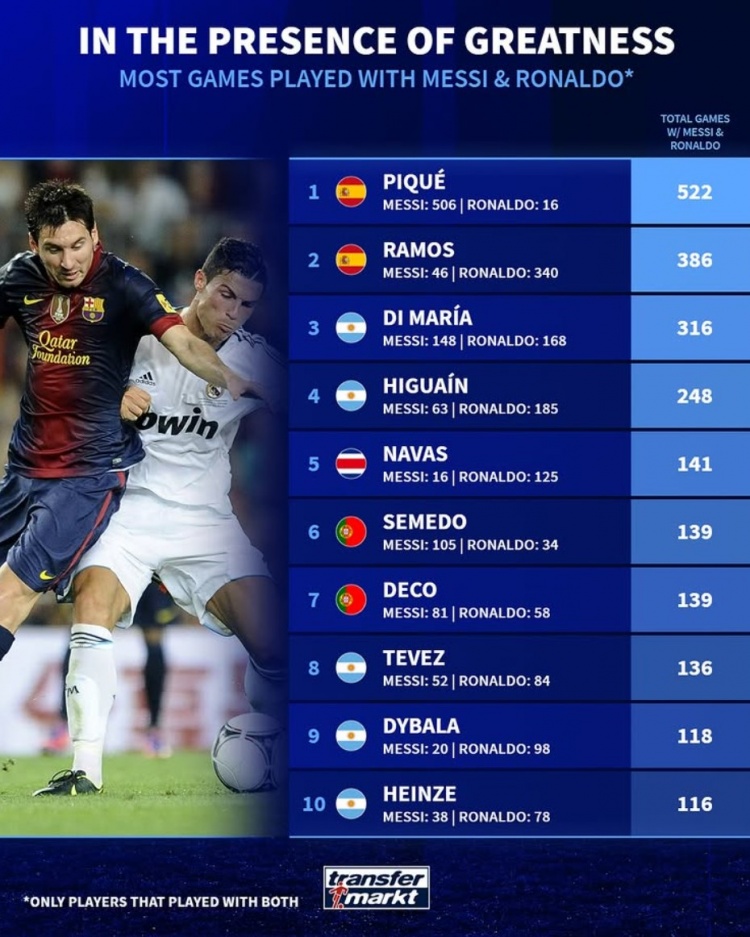 1.皮克,與梅西同場506次,與C羅同場16次,合計(jì)522次