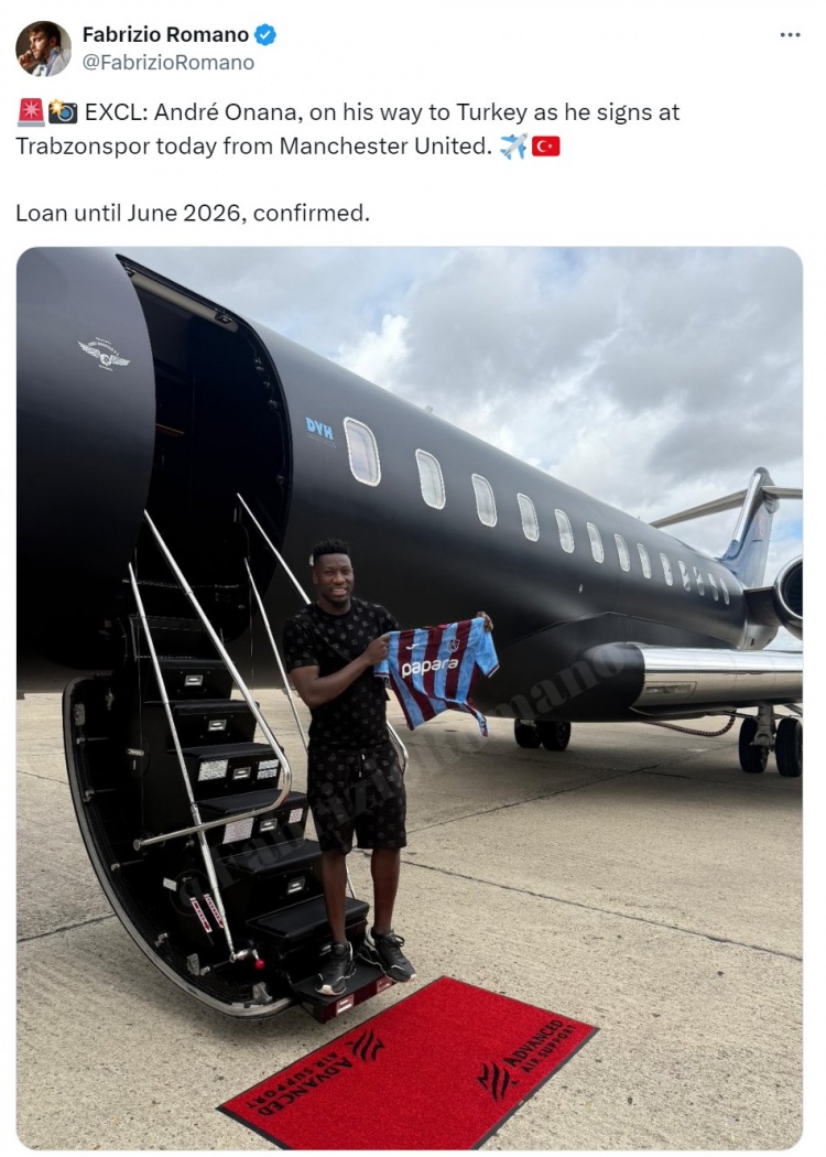 羅馬諾透露,曼聯(lián)門將奧納納正在前往土耳其的路上,他將在今天與特拉布宗體育簽約,租借加盟這家土超俱樂部,租借期限到2026年6月。