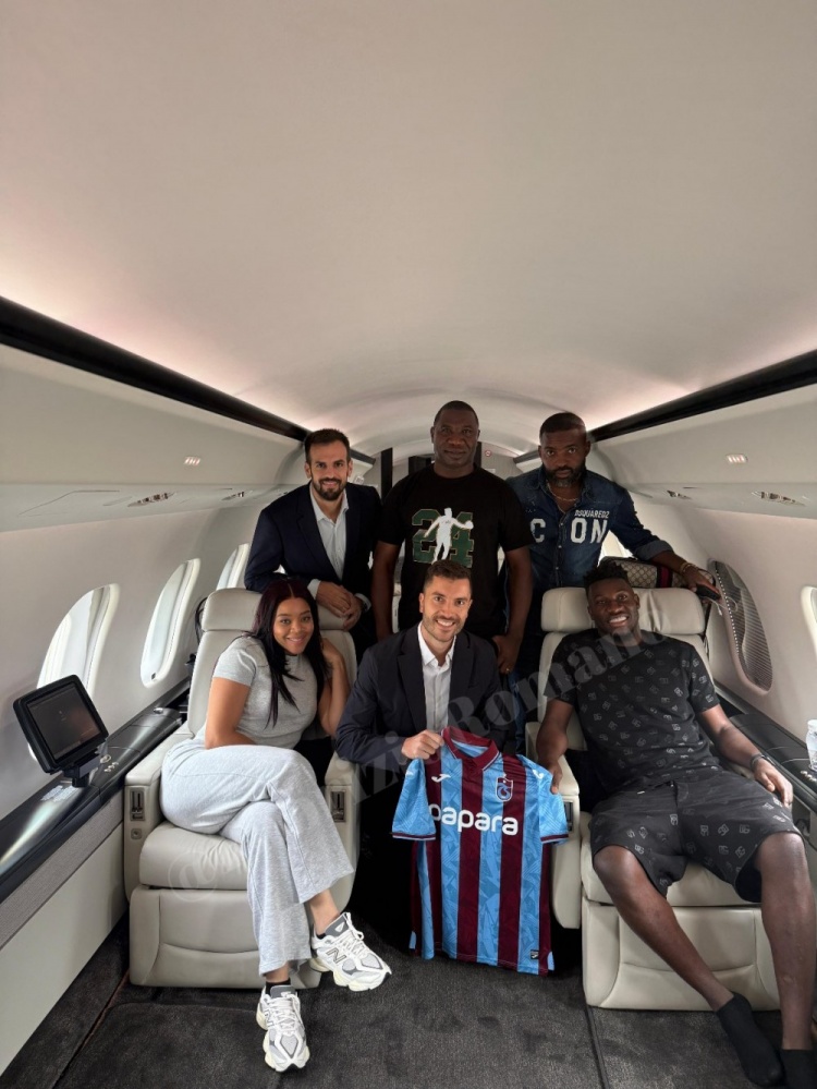 羅馬諾社媒曬出奧納納與家人、經(jīng)紀(jì)人在飛機上展示特拉布宗體育球衣的照片。
