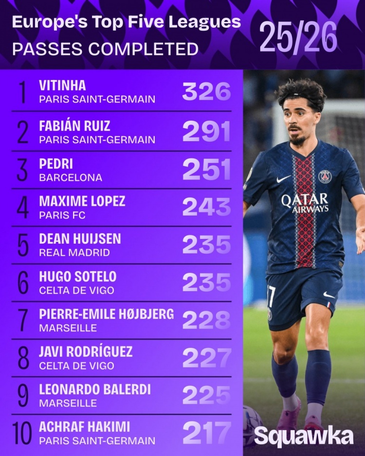 本賽季五大聯(lián)賽成功傳球排名: