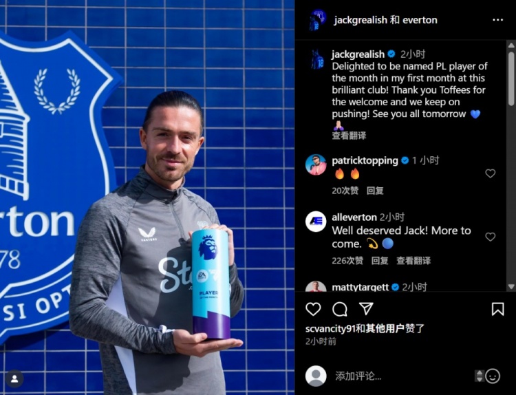球員更新社媒,曬出手捧最佳球員獎杯照片,并寫道:非常高興能在加盟這家出色的俱樂部首月就被評為英超月最佳球員!感謝埃弗頓的歡迎,我們會繼續(xù)努力!明天見????