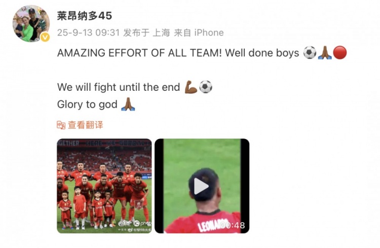 9月13日訊 今天一早,萊昂納多更新社媒,慶祝海港擊敗玉昆。
