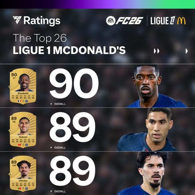 9月13日訊 FC26公布了法甲球員評分榜,其中登貝萊居首,具體如下: