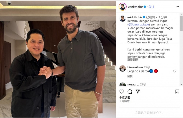 9月13日訊 印尼足協(xié)主席、前國米主席托希爾更新社媒動態(tài),曬出與皮克的合照。