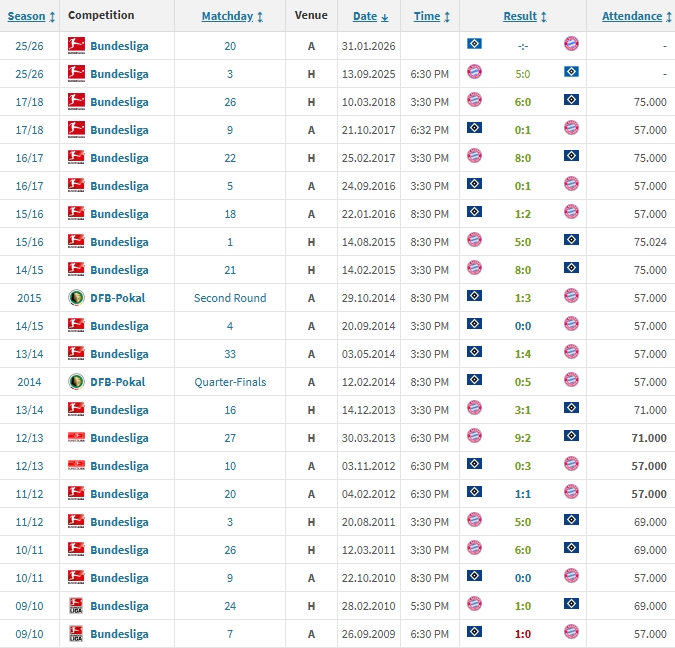 漢堡時隔7年再次對陣拜仁,結果5球慘敗。漢堡各賽事對拜仁已9連敗、20場不勝,且包含多場慘敗,兩次0-8、1次2-9、4次0-5、2次0-6,總比分7-76。