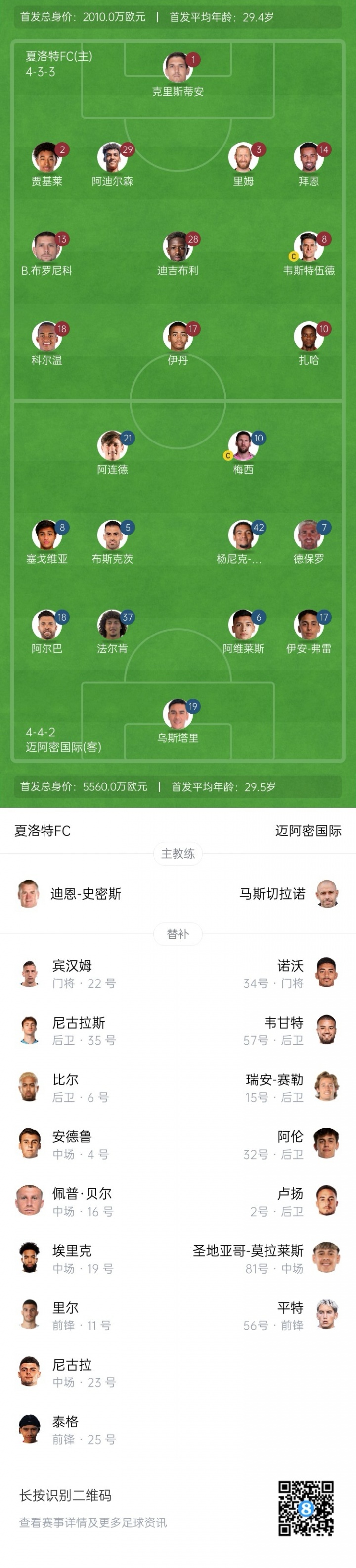 邁阿密國際替補:34-諾沃、57-韋甘特、15-瑞安-賽勒、2-盧揚、32-阿倫、81-圣地亞哥-莫拉萊斯、丹尼爾-平特