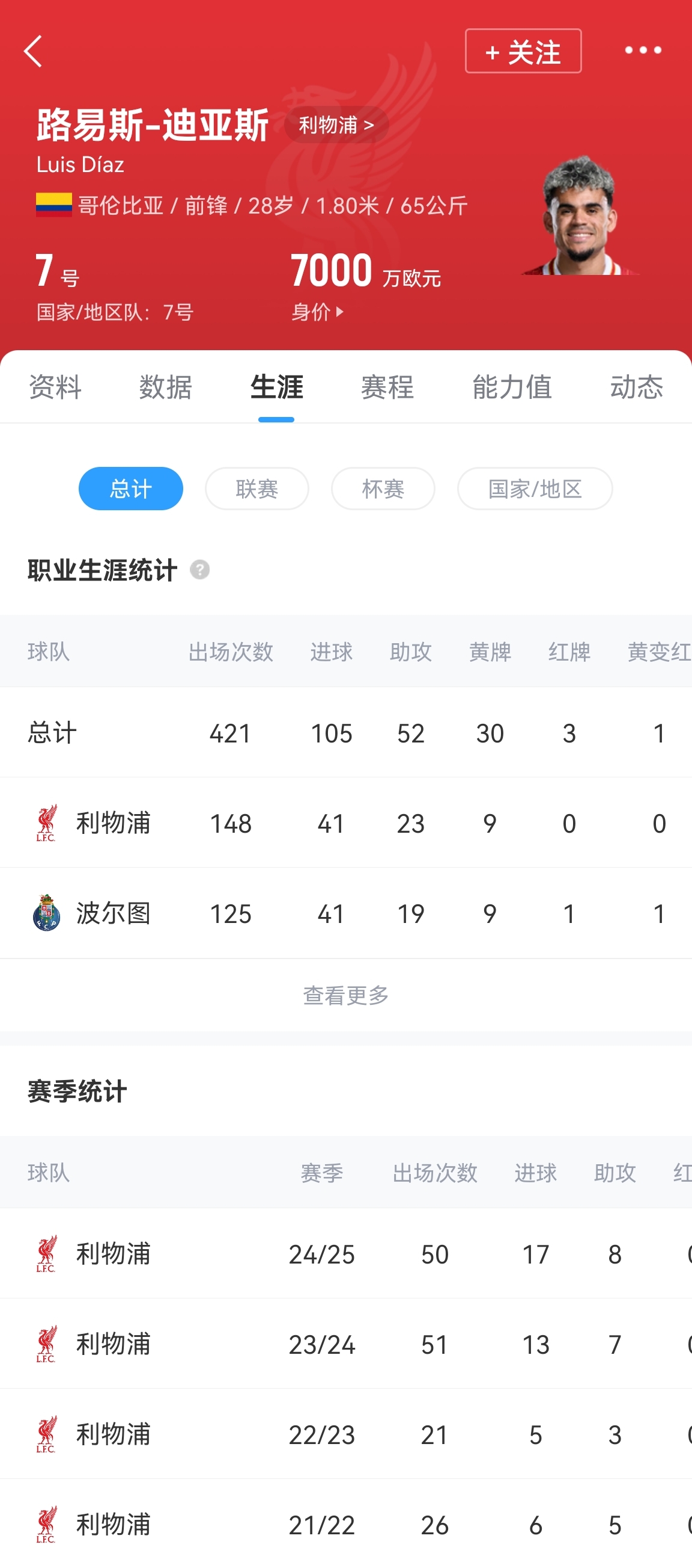 迪亞斯2022年冬窗5400萬歐元從波爾圖轉會利物浦,目前共為利物浦出場148次,打入41球23助攻,他的身價從加盟前的4000萬歐元漲至目前的7000萬歐元。
