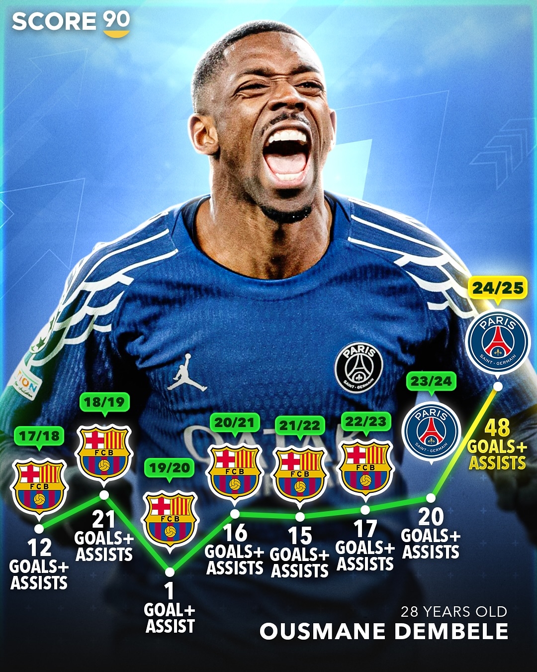 本賽季,登貝萊打出生涯最佳賽季,49場直接參與48球,數(shù)據(jù)遠(yuǎn)超過往賽季,是過去幾個賽季的兩倍多。