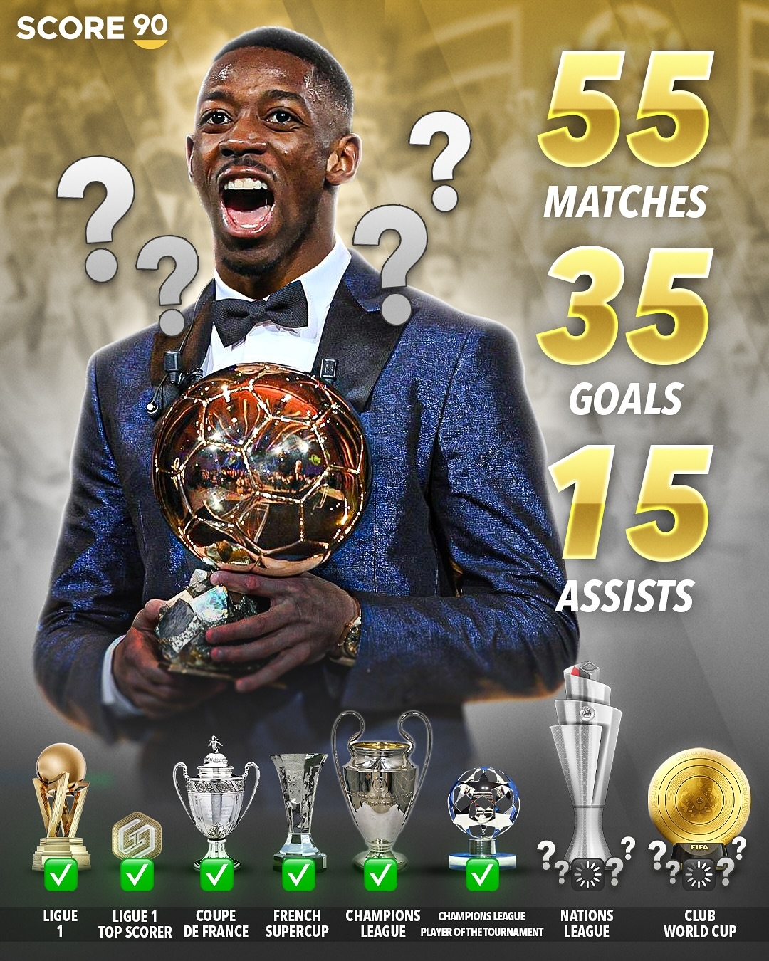 算上國家隊比賽,登貝萊本賽季55場35球15助攻
