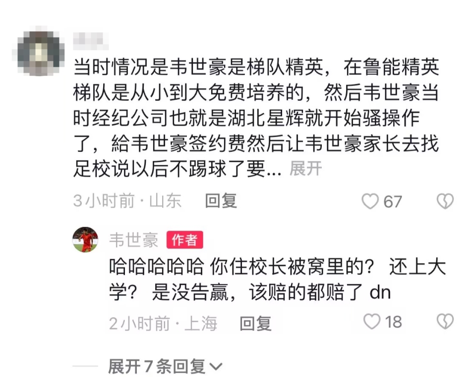 魯能青訓(xùn)曾與韋世豪、唐詩(shī)發(fā)生糾紛,韋世豪再次被推上風(fēng)口浪尖。面對(duì)抖音評(píng)論區(qū)大量的質(zhì)疑,韋世豪親自解釋辯論。
