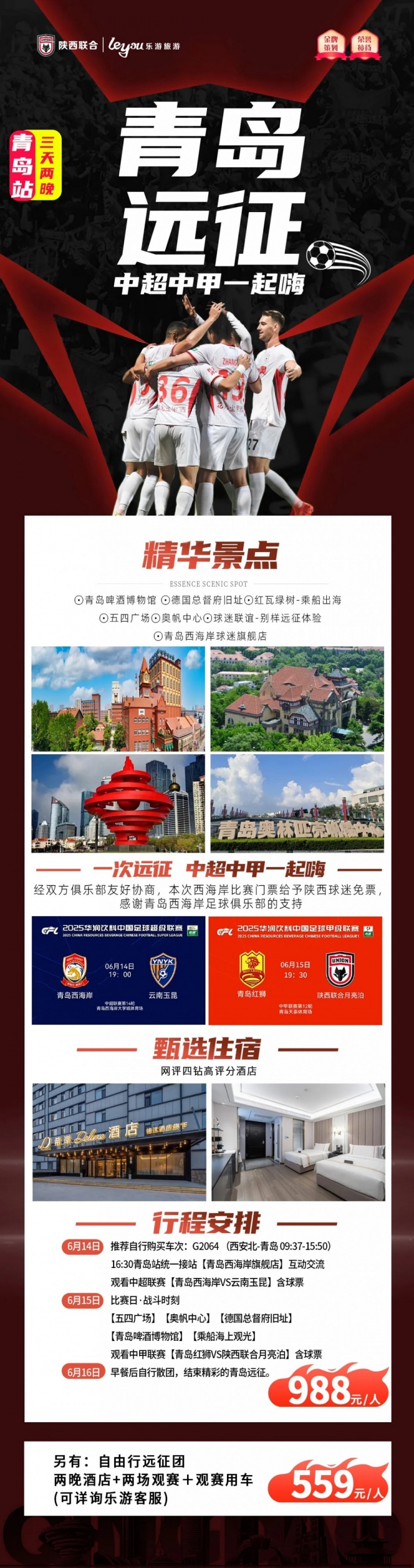 為讓球迷暢享“一次遠征,中超中甲雙賽同觀”的體驗,同時領(lǐng)略青島綠樹紅瓦、碧海藍天的濱海風情,陜西聯(lián)合足球俱樂部與頂級企業(yè)會員「樂游旅游」聯(lián)合重磅推出【青島遠征觀賽團】!本次活動由「樂游旅游」全程策劃執(zhí)行,現(xiàn)面向廣大球迷火熱招募,詳情如下: