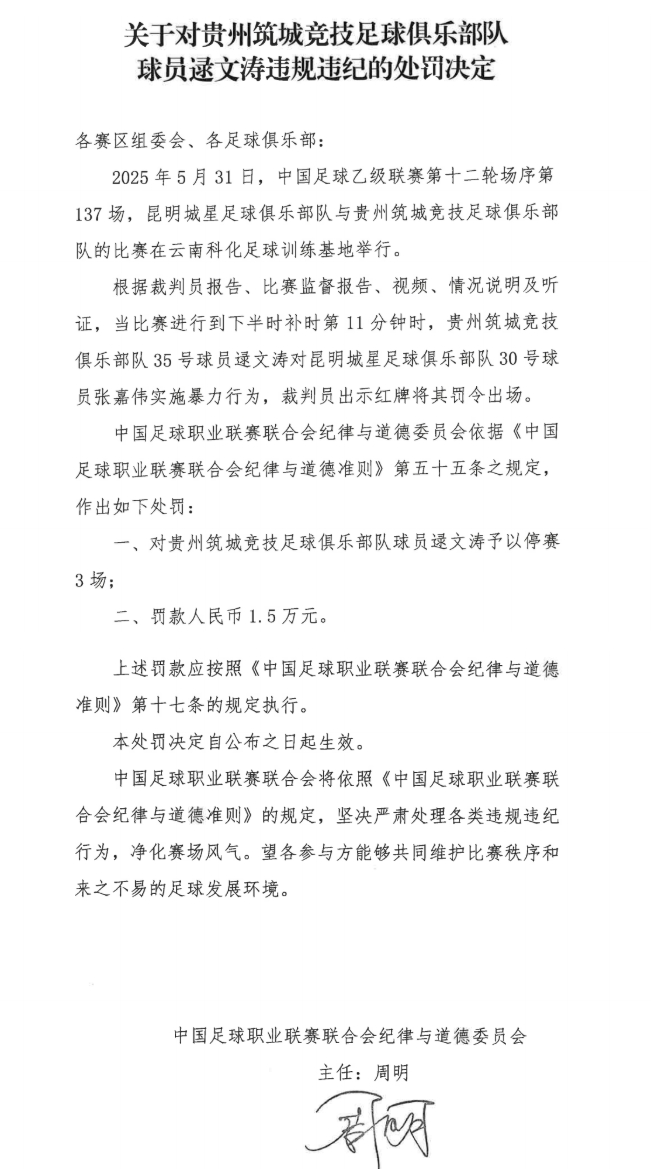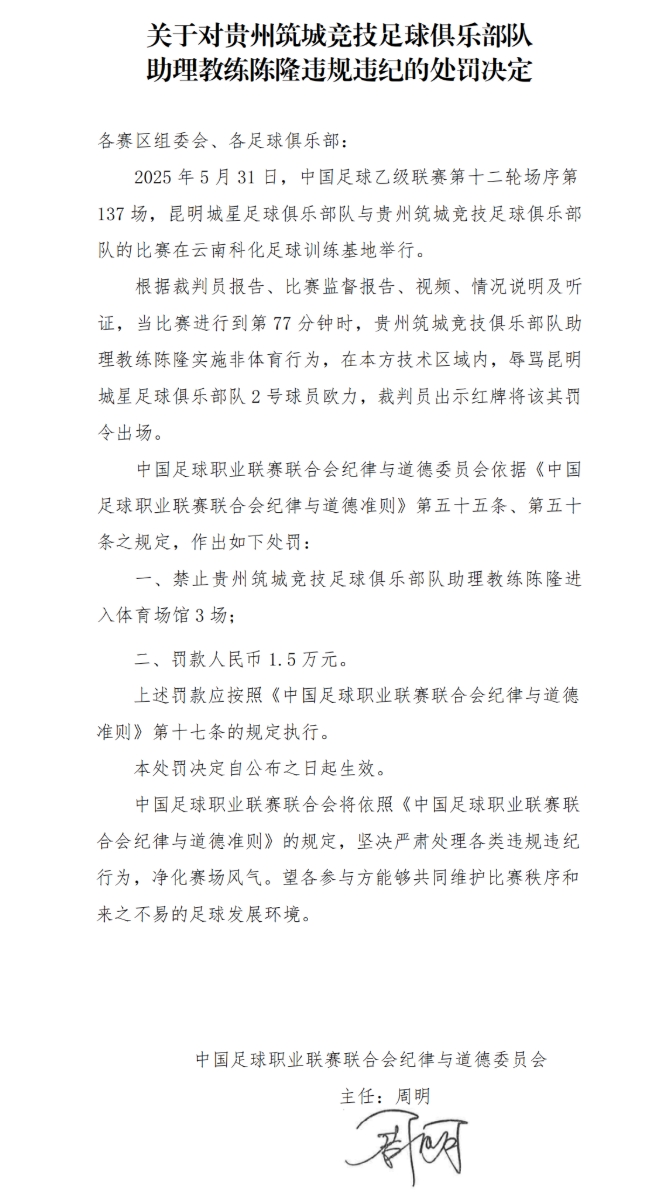06月04日訊 中足聯(lián)官方公布了對于貴州筑城競技足球俱樂部隊助理教練陳隆、球員逯文濤、球員張家欣的違規(guī)違紀的處罰決定。