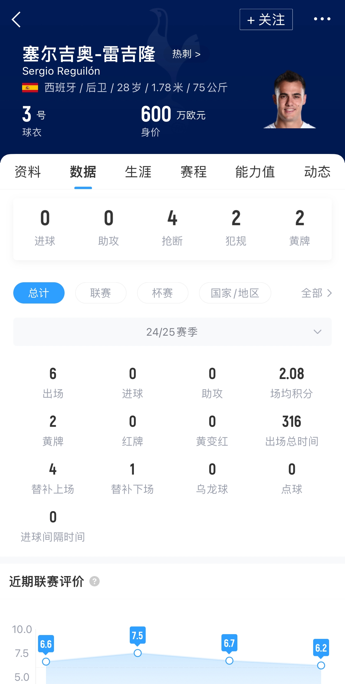 雷吉隆本賽季僅為熱刺各項(xiàng)賽事總計(jì)出場(chǎng)過六場(chǎng)比賽,獲得316分鐘上場(chǎng)時(shí)間。