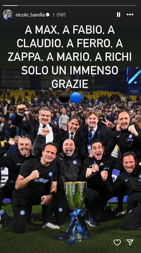 6月5日訊 國米主帥小因扎吉離任,巴雷拉更新社媒動態(tài),對他及其教練團(tuán)隊表示感謝。