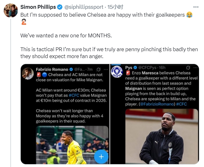 記者Simon Phillips:“我認為切爾西對他們的守門員滿意,幾個月來我們一直想要一名新門將。