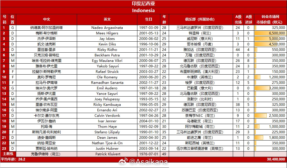印尼隊(duì)23人名單平均年齡26.2歲,總身價(jià)3040萬歐元,身價(jià)最高的球員是希爾格斯,達(dá)到650萬歐元,隊(duì)內(nèi)共有8位球員身價(jià)超過100萬歐。