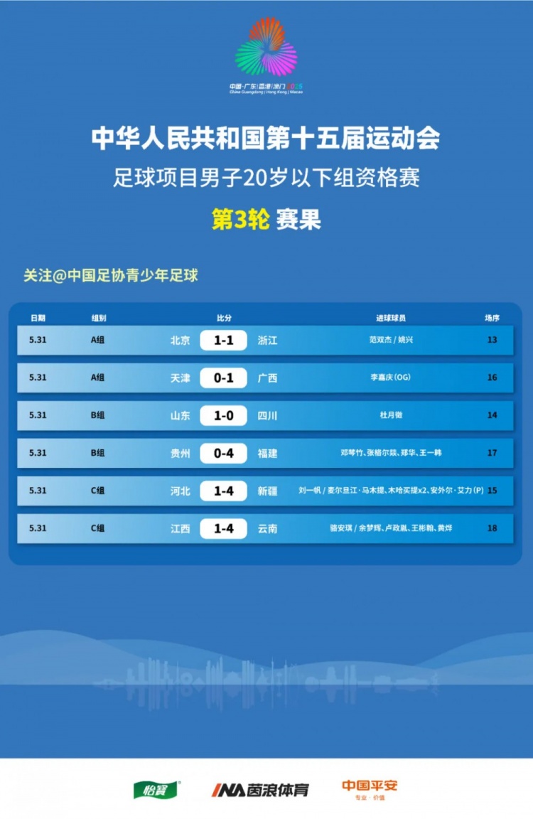 6月1日訊 5月31日,第15屆全運會男足20歲以下組資格賽繼續(xù)進行。其中廣西、山東、福建、新疆、云南取得勝利,當日唯一一場平局是北京與浙江的比賽。