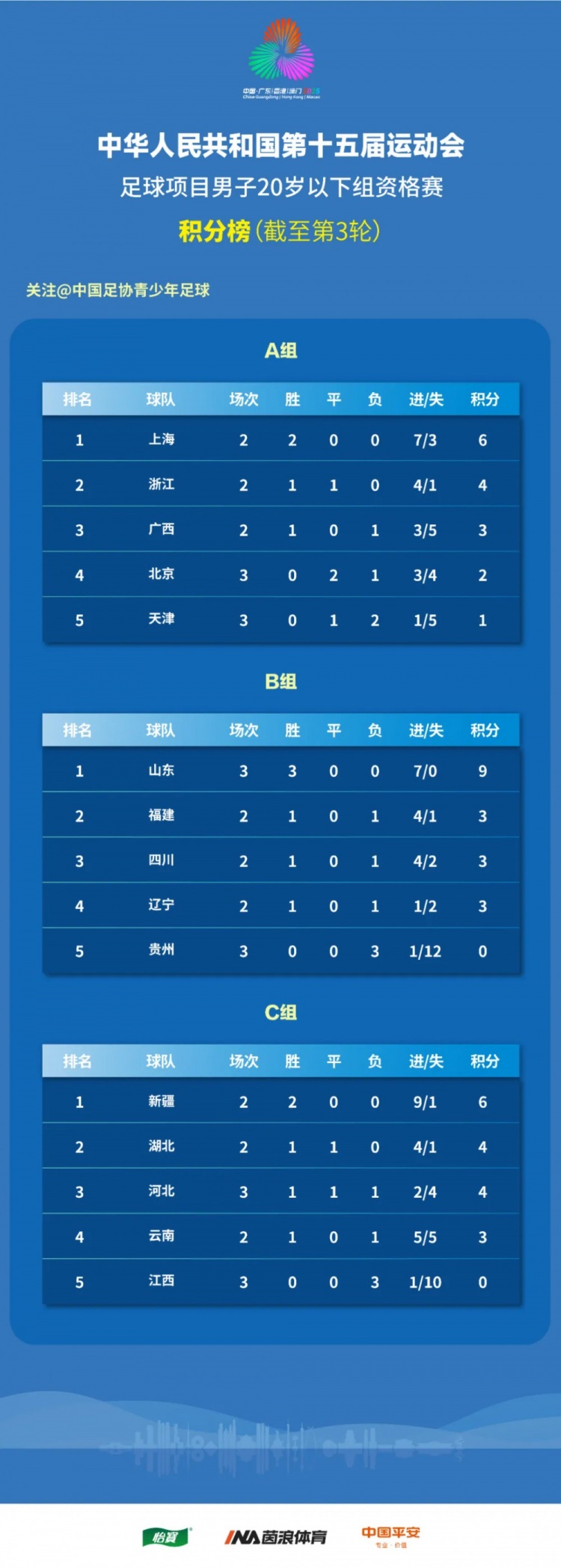 積分方面,目前三個組的榜首分別是上海、山東、新疆,其中山東積9分,是第一支達成三連勝的球隊。榜單末端,B組的貴州和C組的江西都遭遇三連敗,目前還沒有取得積分。