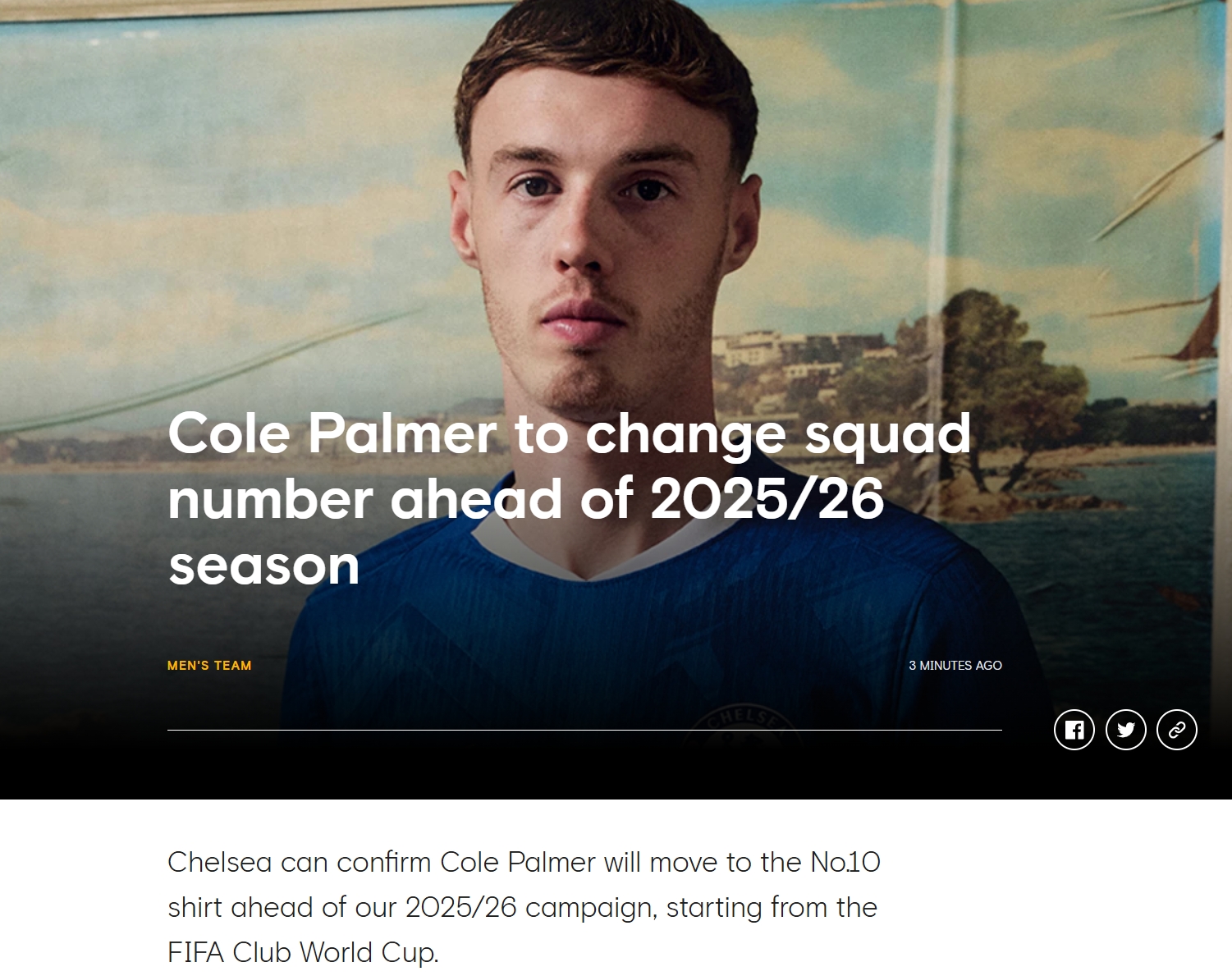 06月05日訊 切爾西官方發(fā)布公告,宣布帕爾默將在2025/26賽季改穿10號(hào)球衣,帕爾默將從世俱杯開始身披10號(hào)球衣。