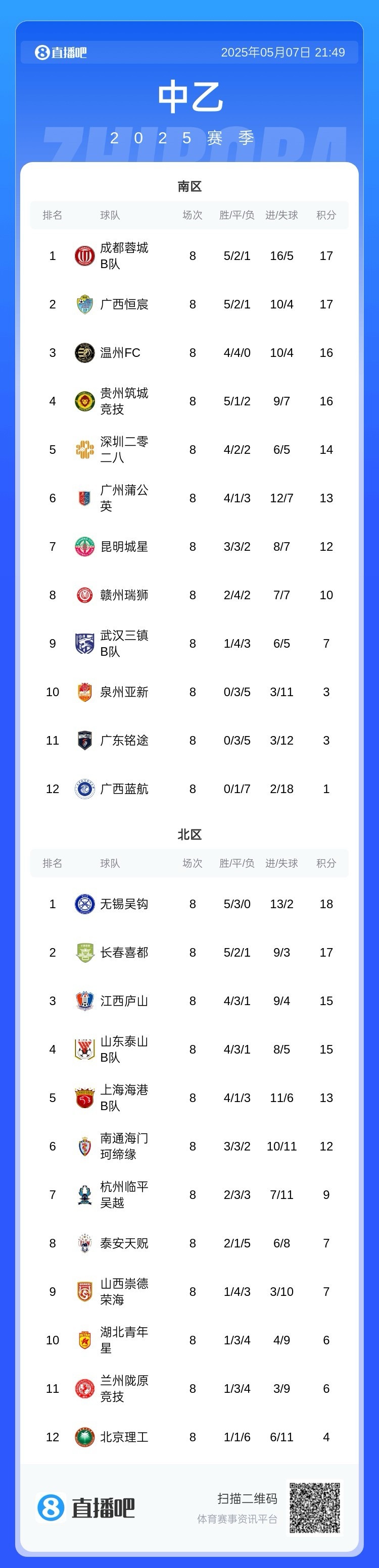5月7日訊 中乙第8輪結(jié)束爭奪,蓉城B隊4-0大勝廣西藍航領(lǐng)跑南區(qū),泰山B隊收獲兩連勝升至北區(qū)第四。