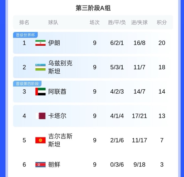 06月06日訊 世預(yù)賽A組第9輪烏茲別克斯坦客場(chǎng)0-0戰(zhàn)平阿聯(lián)酋,烏茲別克斯坦9輪比賽打進(jìn)11球,丟7球拿到18分,歷史首次晉級(jí)世界杯正賽。