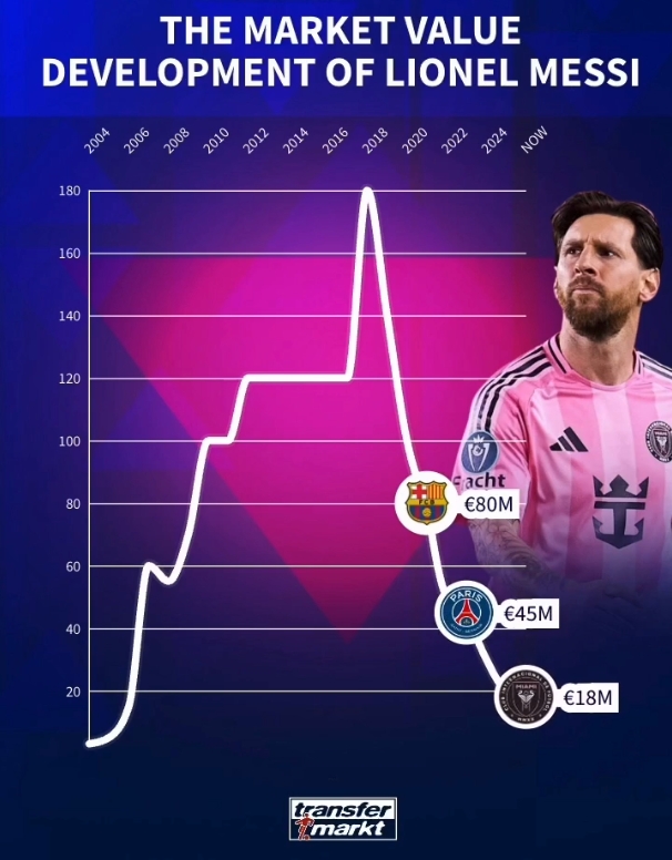 德轉(zhuǎn)發(fā)布梅西身價(jià)變化視頻,23歲身價(jià)破億,30歲達(dá)到巔峰的1.8億歐,如今37歲身價(jià)1800萬(wàn)歐。