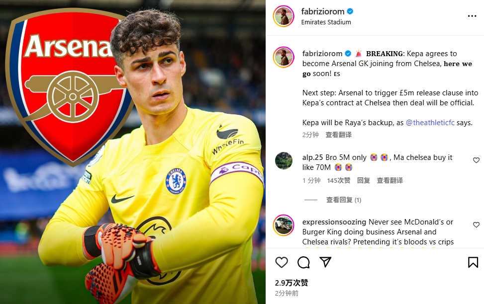 羅馬諾表示:凱帕已經(jīng)同意從切爾西轉(zhuǎn)投阿森納,Here We Go Soon!接下來阿森納將觸發(fā)凱帕合同中500萬鎊的解約條款,將這筆交易正式化。