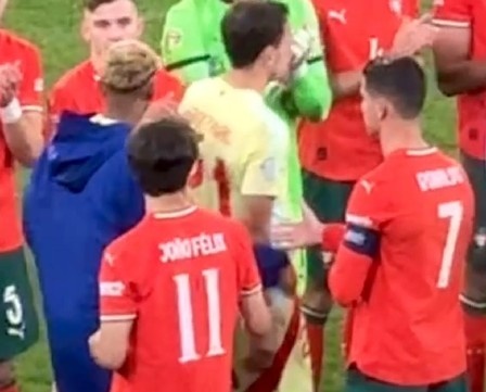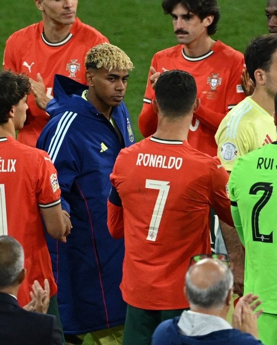 視頻顯示,賽后頒獎儀式,40歲的C羅主動伸手想和亞馬爾握手,后者握手時則將臉側(cè)向一旁。