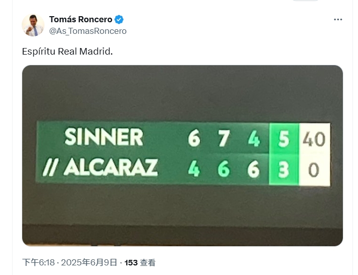 阿斯報(bào)主編、皇馬死忠龍塞羅曬出了辛納手握3個(gè)賽點(diǎn)的比分截圖,配文:皇馬精神。