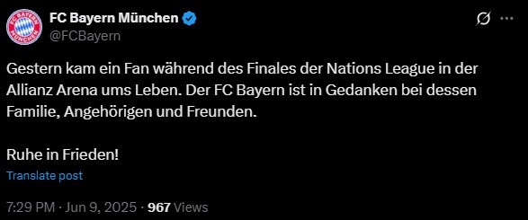拜仁官推寫道:“今天凌晨歐國聯(lián)決賽期間,一名球迷在安聯(lián)球場不幸離世。拜仁慕尼黑俱樂部與逝者家人、親友同在。”