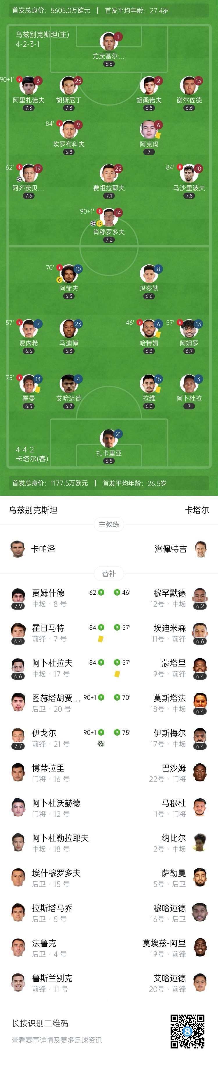 全場比賽結束,烏茲別克斯坦3-0擊敗卡塔爾。