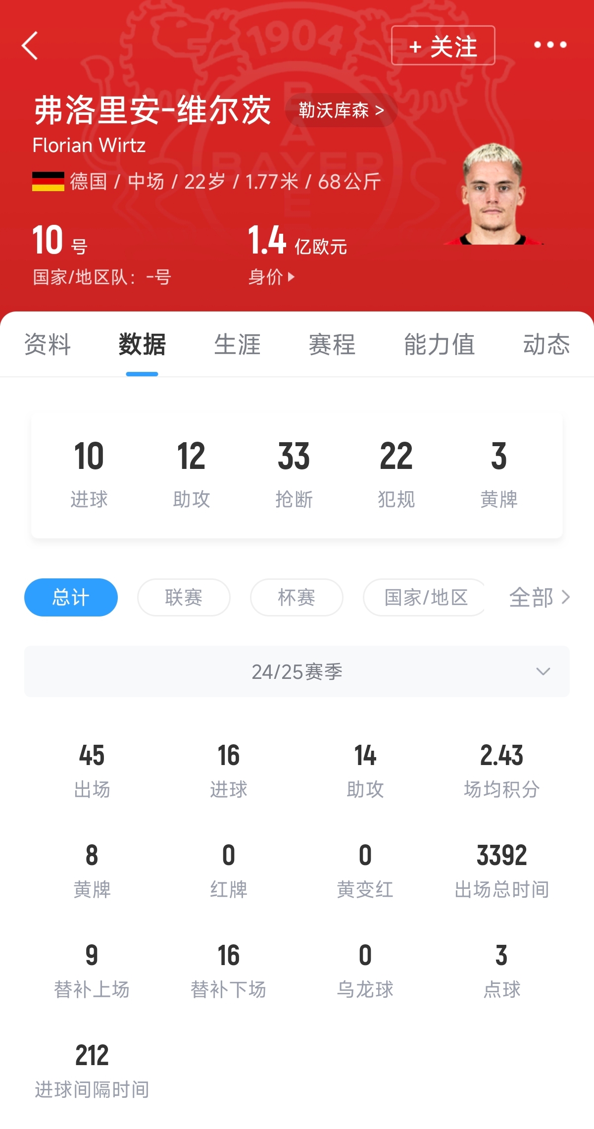 維爾茨現(xiàn)年22歲,本賽季代表勒沃庫(kù)森出戰(zhàn)45場(chǎng),首發(fā)36次,貢獻(xiàn)了16球14助攻。