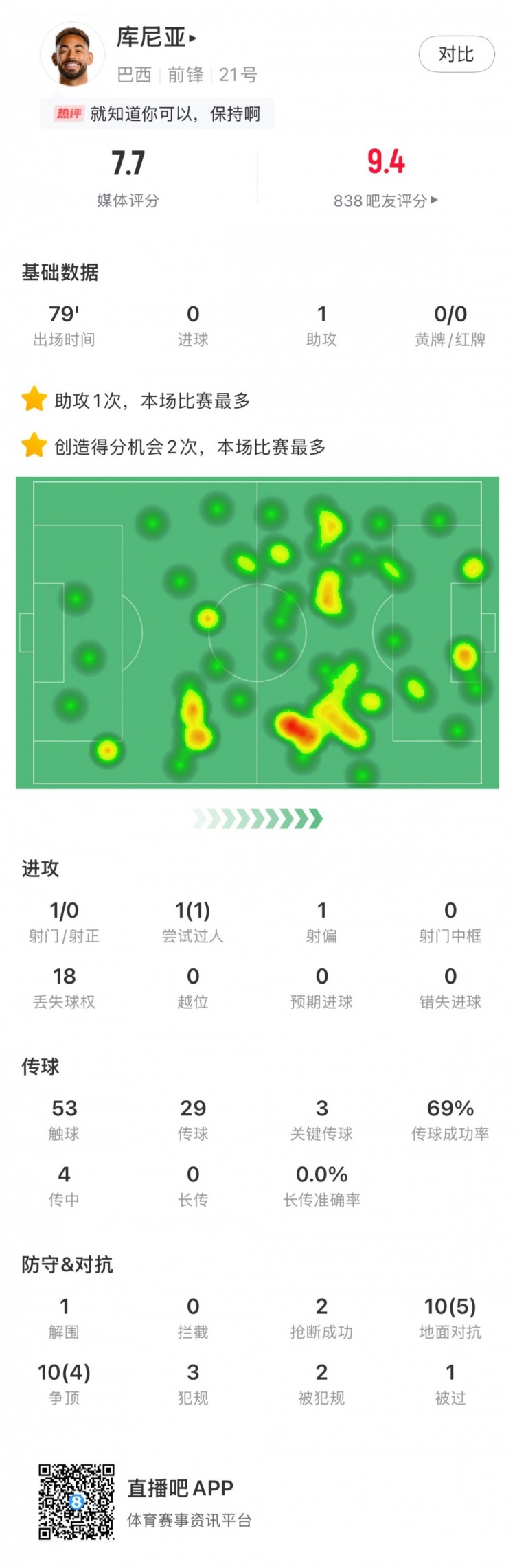 6月11日訊 世預賽南美區(qū)第16輪,巴西1-0巴拉圭,庫尼亞首發(fā)出戰(zhàn),球員本場數(shù)據(jù)如下: