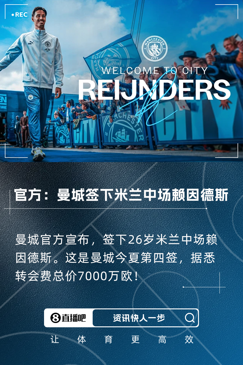 6月11日訊 官方消息,曼城正式從AC米蘭簽下26歲的中場(chǎng)球員賴因德斯。據(jù)此前報(bào)道,賴因德斯的轉(zhuǎn)會(huì)費(fèi)總價(jià)最高可達(dá)7000萬(wàn)歐元,包括5500萬(wàn)歐元固定+1500萬(wàn)歐元浮動(dòng)。
