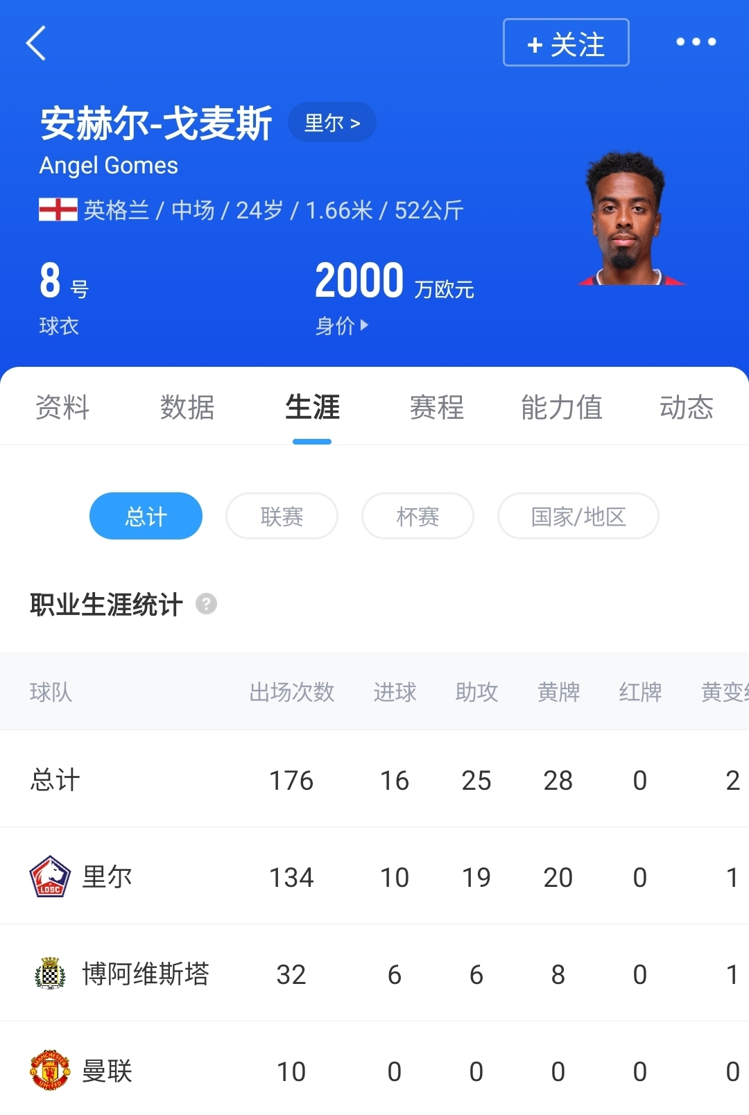 安赫爾-戈麥斯,現(xiàn)年24歲,英格蘭中場(chǎng),出自曼聯(lián)青訓(xùn),2020年夏窗球員以自由身加盟里爾,今年6月與里爾合同到期,目前德轉(zhuǎn)身價(jià)2000萬(wàn)歐。