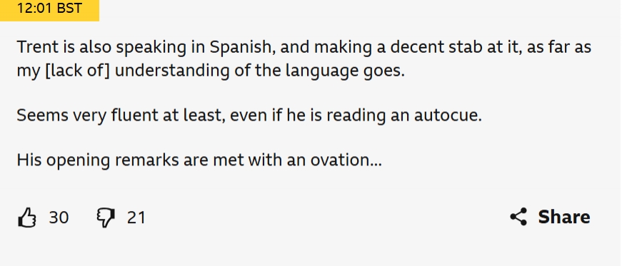 BBC實(shí)時(shí)博客更新了一段文字:阿諾德也會(huì)說西語,而且就我對(duì)這門語言的理解,他已經(jīng)說得不錯(cuò)了,至少聽起來非常流利,即使他在看提詞器。他的開場白也贏得了熱烈的掌聲。