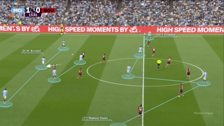 傷病問(wèn)題是圣誕節(jié)前狀態(tài)下滑的催化劑,但近幾個(gè)月來(lái),曼城已顯現(xiàn)復(fù)蘇的跡象。瓜迪奧拉通過(guò)調(diào)整戰(zhàn)術(shù)體系,使邊后衛(wèi)在曼城進(jìn)攻時(shí)能保持更靠前、更寬闊的站位。下圖所示,即為他們?cè)谟⒊詈笠粋€(gè)主場(chǎng)對(duì)陣伯恩茅斯時(shí)的場(chǎng)景,在組織進(jìn)攻階段,科瓦西奇回撤至防線,形成3-2-5陣型。