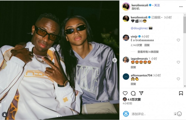 6月16日訊 曼城女足前鋒克羅琳更新社媒動(dòng)態(tài),曬出與維尼修斯的親密合照。