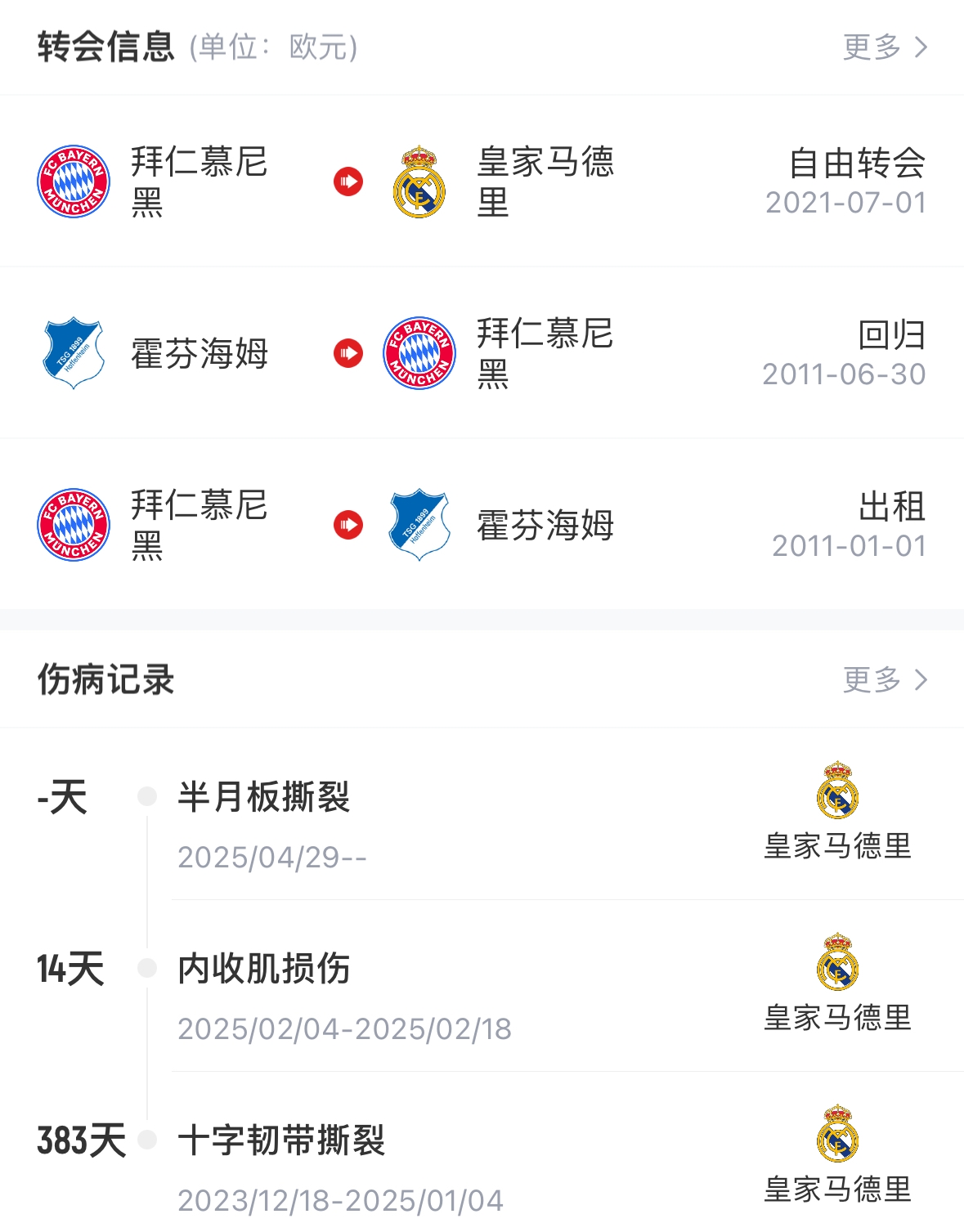 阿拉巴于2021年夏窗從拜仁免簽加盟皇馬,在23年底,阿拉巴遭遇了十字韌帶撕裂,于今年年初才傷愈歸來。