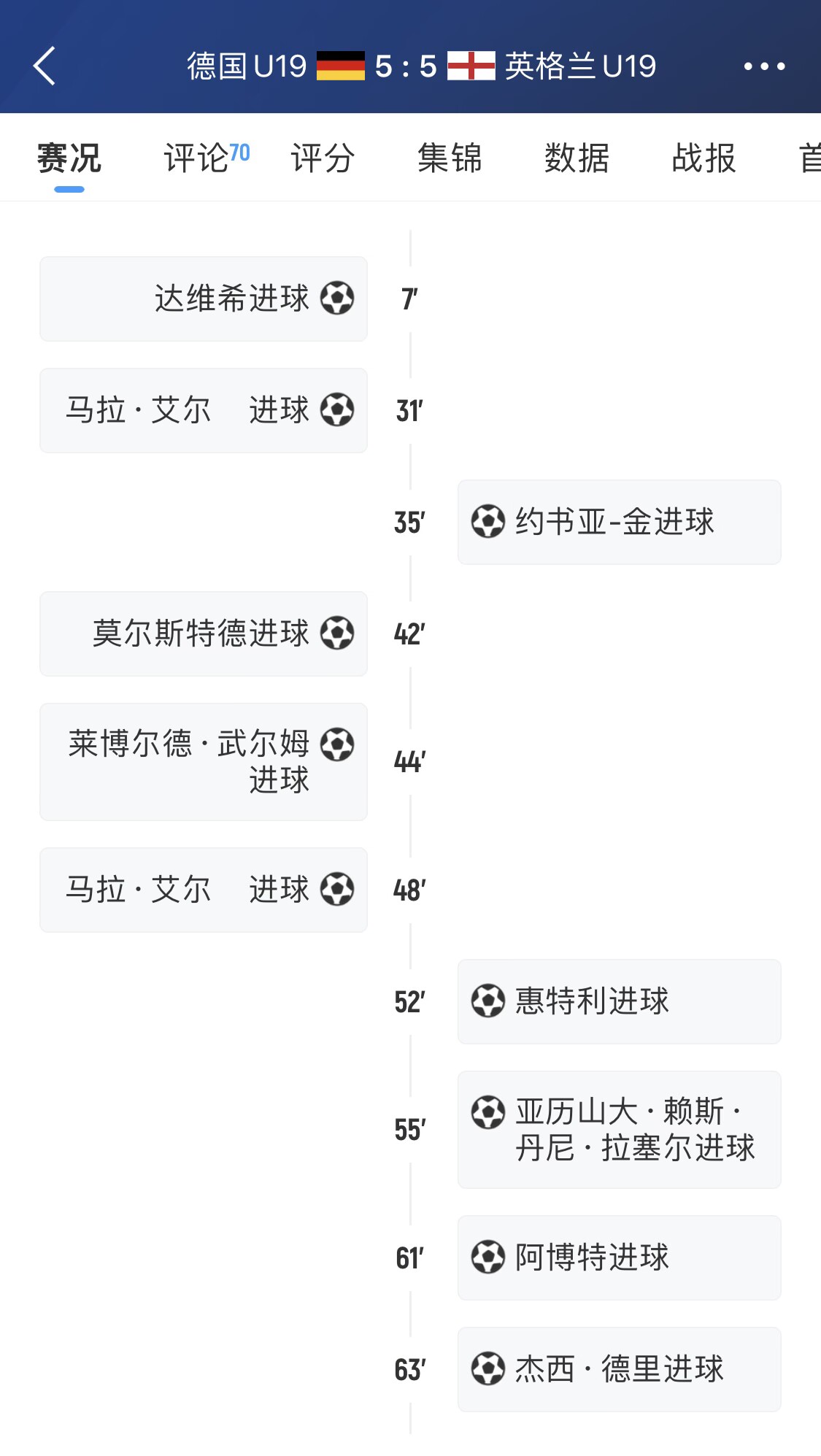 06月18日訊 U19歐青賽小組賽第二輪,德國U19在5-1領(lǐng)先的情況下,被英格蘭連扳4球5-5逼平,喪失半決賽晉級主動權(quán)。