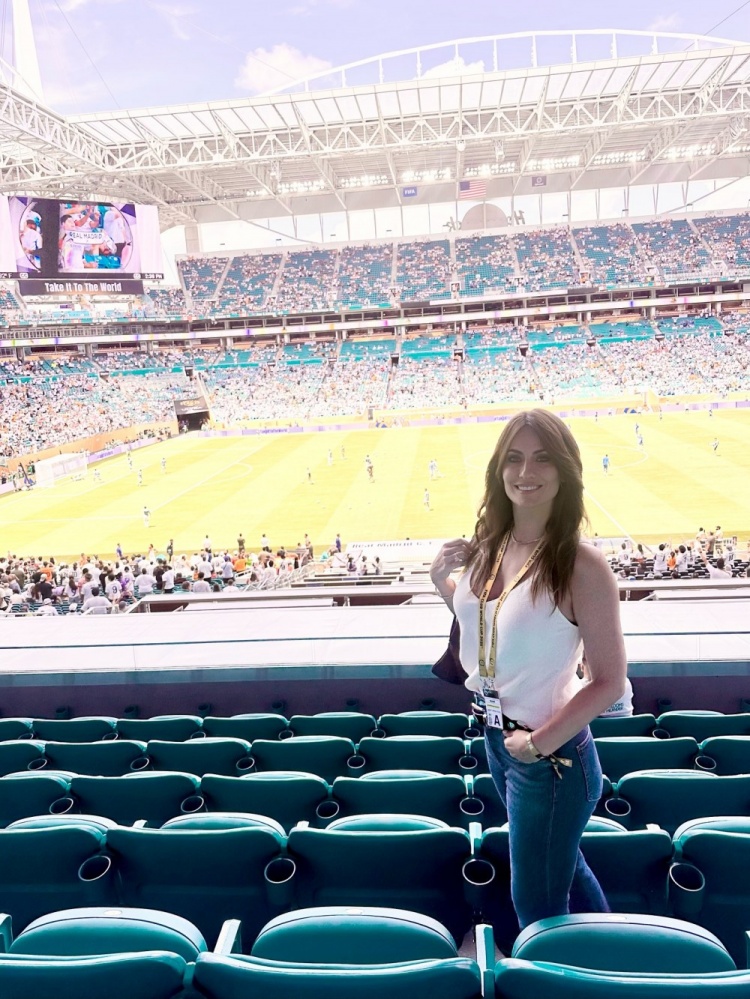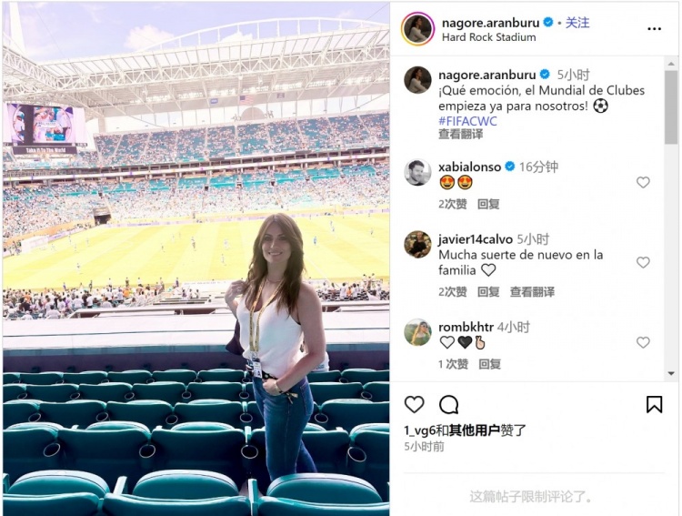 皇馬新帥阿隆索的妻子阿蘭布魯來到現(xiàn)場(chǎng)觀看比賽,賽前她在社交媒體上曬出照片,配文:“好激動(dòng),我們的世俱杯征程馬上要開始了!”
