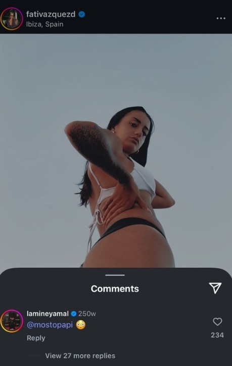 對于亞馬爾的行為,萬能的網(wǎng)友發(fā)現(xiàn)西班牙小將似乎早就認(rèn)識(shí)Fati Vazquez。在社交媒體上,有人曬出了亞馬爾13歲時(shí)就對Fati Vazquez發(fā)布的社媒進(jìn)行評論的照片。